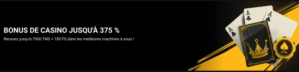 | Bonus casino jusqu’à 375 % | 40 TND | 7 000 TND + 180 tours gratuits | Bonus de 30 fois dans les 7 jours | Bonus de 100 % pour le premier dépôt d’une valeur maximale de 1 800 TND + 180 TG.Bonus de 125 % pour le deuxième dépôt d’une valeur maximale de 2 000 TND.Bonus de 150 % pour le troisième dépôt d’une valeur maximale de 3 200 TND. |